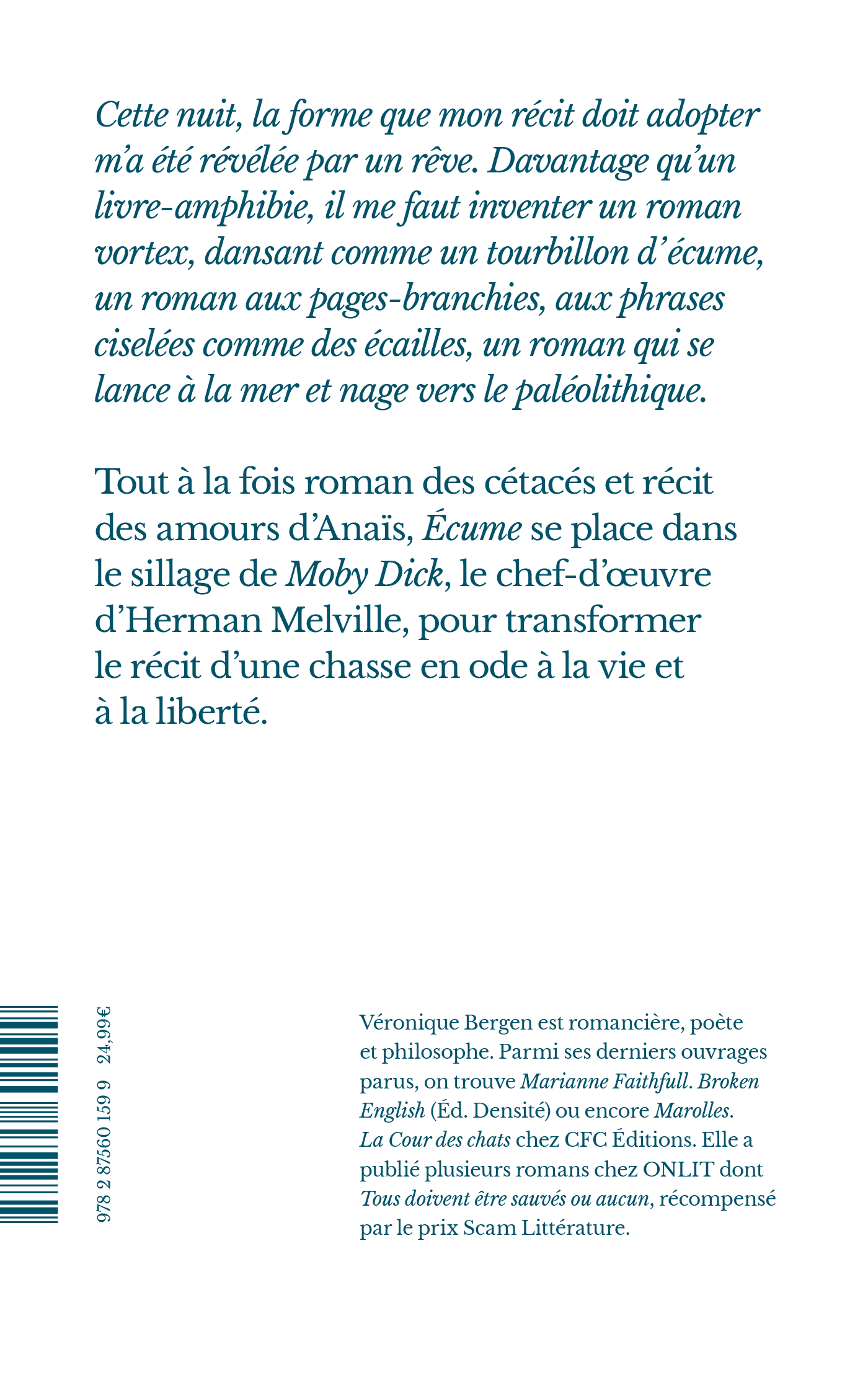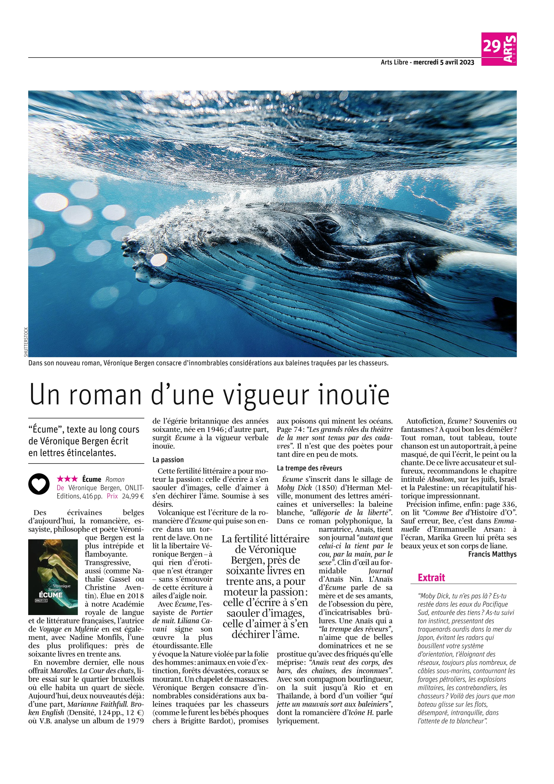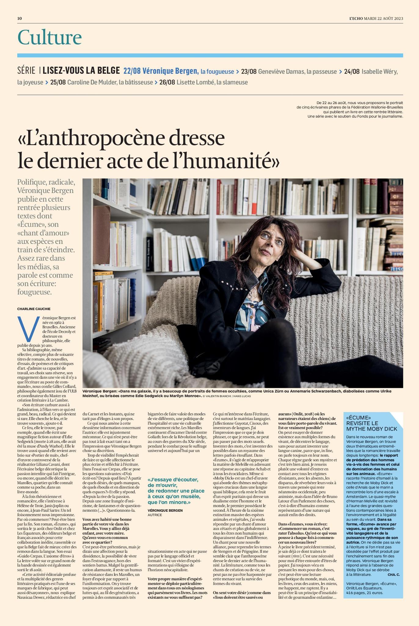 "Le quasi-mythe d’Herman Melville est revisité à l’aune des grandes questions contemporaines liées à l’environnement et à l’égalité au sein du vivant. Dans sa forme, Écume avance par vagues, au gré de l’inventivité langagière et de la puissance rythmique de son autrice. On ne dédie pas sa vie à l’écriture si l’on n’est pas obsédée par l’effet produit par deux phrases qui s’emmanchent avec une troisième, une quatrième et les suivantes.Véronique Bergen répond ainsi à l’absence de Moby Dick qui se dérobe par la littérature qui se déploie." Charline Cauchie, L'Echo